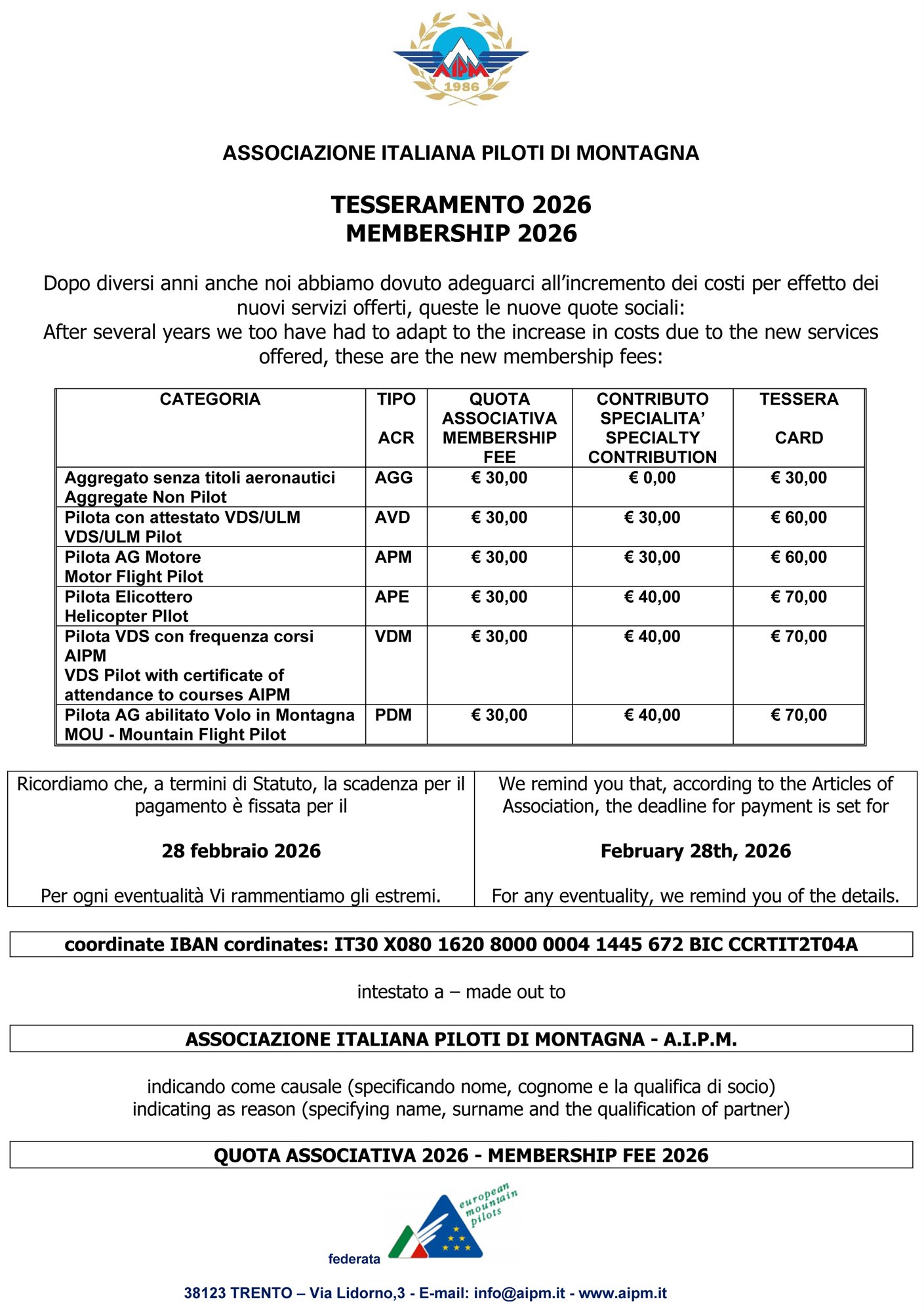 For those wishing to comply with the 2026 Membership, we propose the deliberated fees.