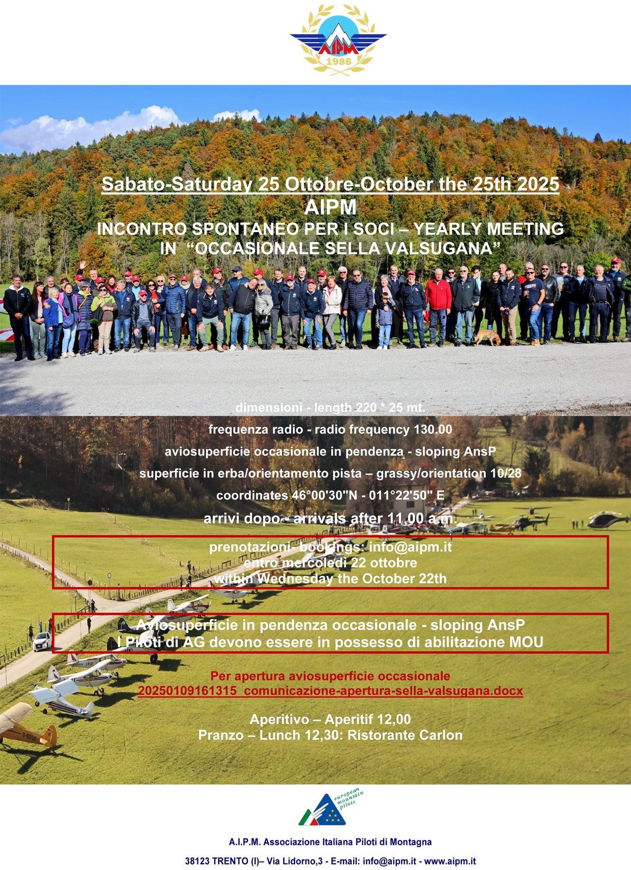 Saturday, October 25: Annual spontaneous end-of-summer season meeting in Sella Valsugana. We look forward to seeing you.